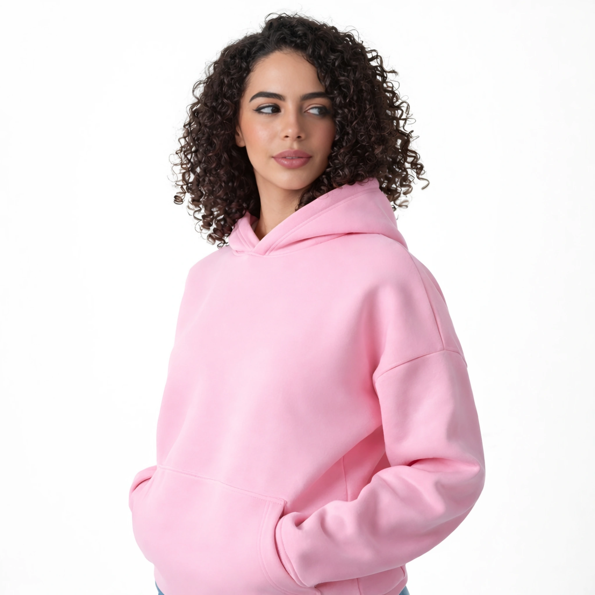 هودي أوفر سايز باللون بينك من نسيج، خامة قطن 100% توفر الراحة والدفء، مثالي للستايل اليومي والملابس الكاجوال.